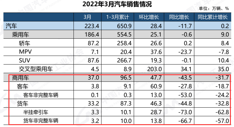 据中国汽车工业协会发布2022年3月汽车产销数据显示,3月商用车销37万辆,环比增长47.7%,同比下降43.5%。其中,重卡销7.7万辆,轻卡销18.2万辆,依然是仅微卡和大客累计销量实现正增长。