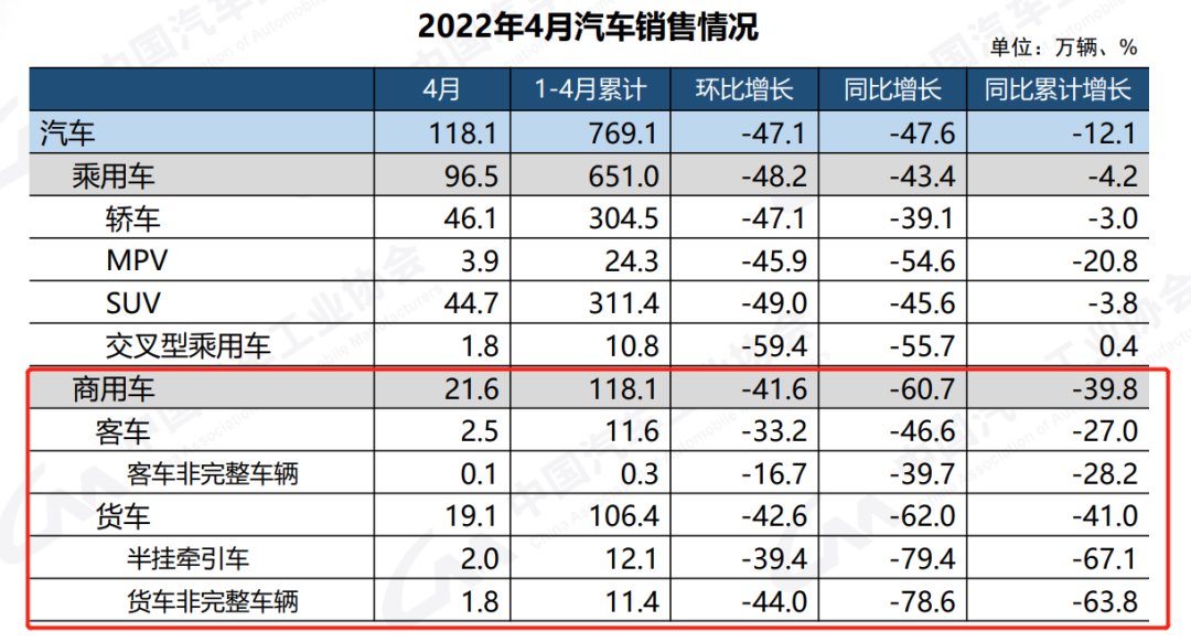 中国汽车工业协会发布了2022年4月汽车产销数据。数据显示,4月商用车销21.6万辆,环比下降41.6%,同比下降60.7%。其中,重卡销4.4万辆,下降幅度最为明显;轻卡销10.7万辆,降幅也超5成。